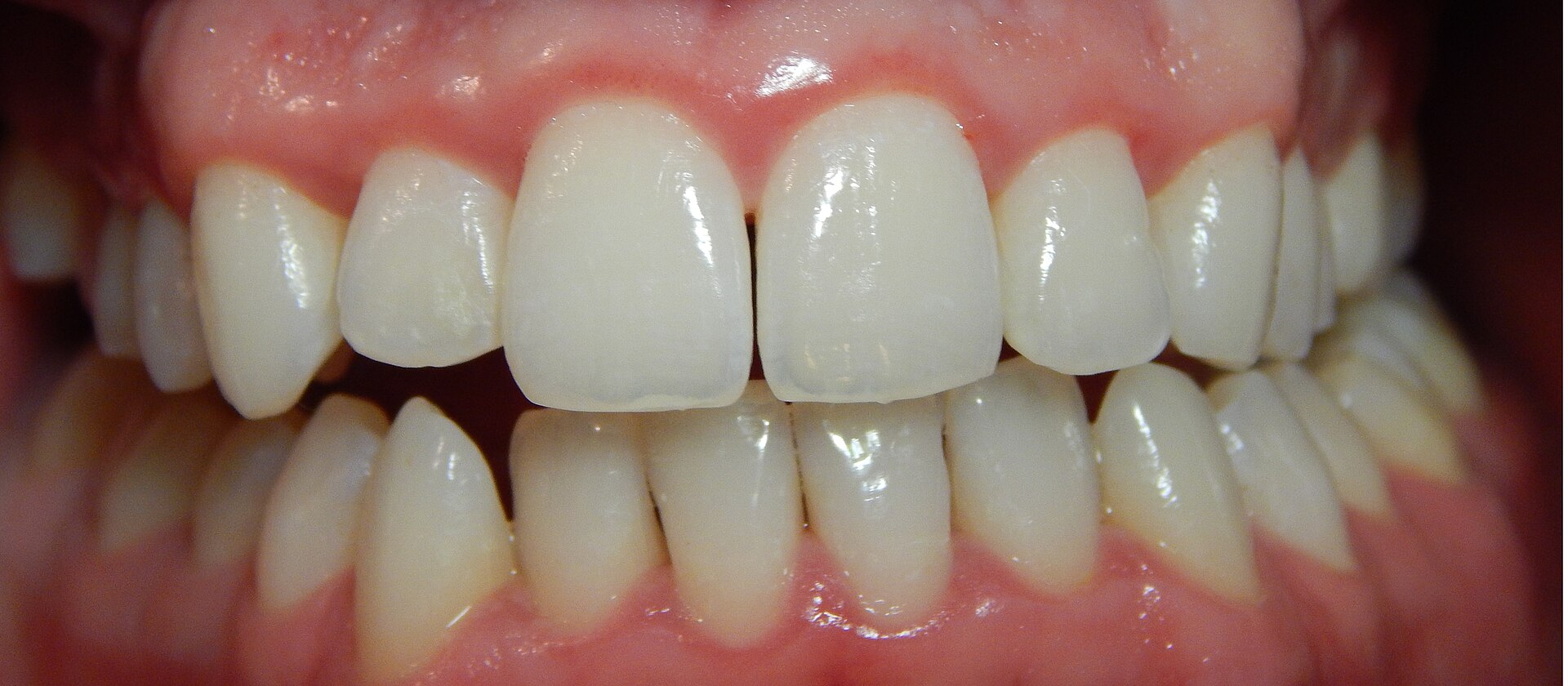 - Recession gingivale visible (dents qui semblent plus longues)